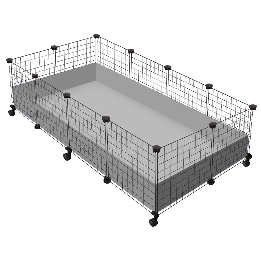 Remove piggies, toys, hideys, bedding and corflute in cage. Carefully turn cage onto its side to install floor grids and centre connectors, securing with zip ties. Replace corner and centre connectors of your cage base, on the front and back edges, with new wheel connectors. See display image for example.